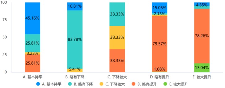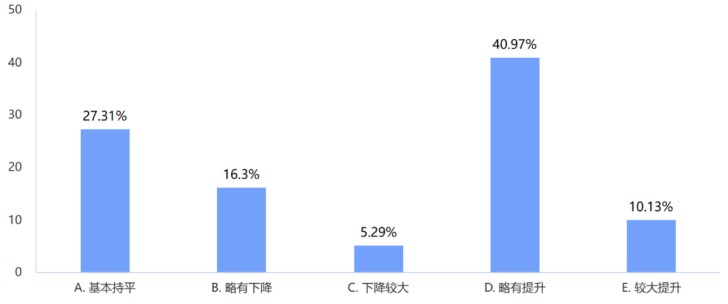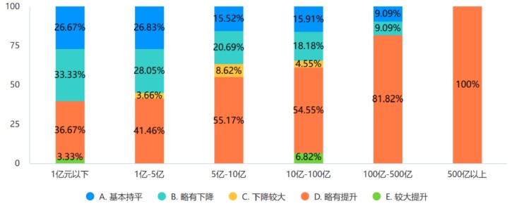 其中,年营收规模在100亿元以上的企业,选择“略有提升”的比例较上年数据有较大提高,显示出大型企业在经济不景气时期的马太效应明显。选择“下降较大”的,较多集中在年营收规模5亿~10亿元的企业。