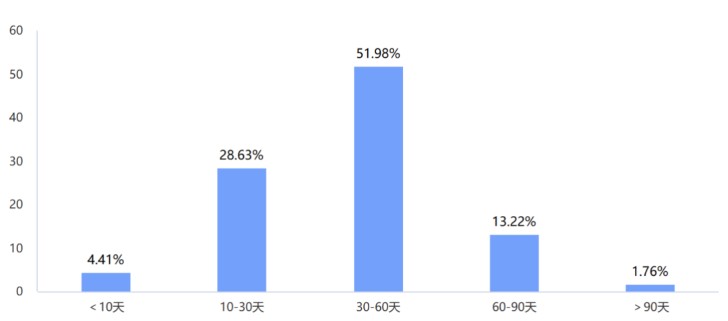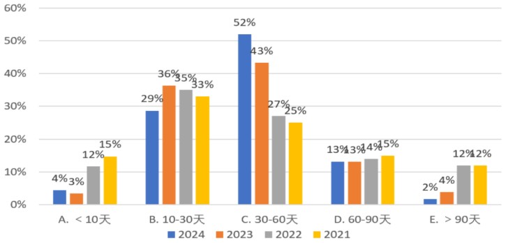库存年周转天数在30~60天的企业占比52%,连续4年持续增加;而无论是小于10天或是大于10天的企业占比持续减少。数据呈现明显的向10~60天增加。见图4、图5。