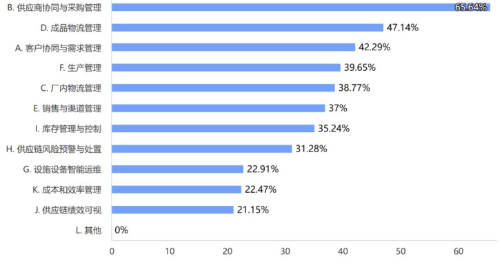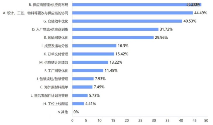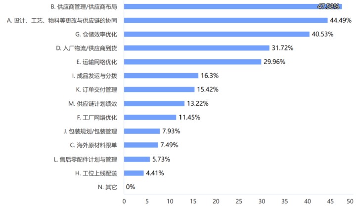 该数据与往年的基本一致,供应商管理/供应商布局,占比48%;设计、工艺、物料等更改与供应链的协同,占比44%;仓储效率优化,占比40%。这三项是制造企业当前供应链改善的重点环节。见图8。