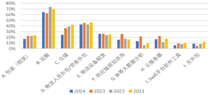 目前制造企业的供应链外包业务仍集中于传统的运输、劳务外包和物流设备租赁及仓储。其中“仓储”外包呈现连年下降的趋势。见图9、图10。