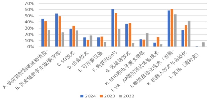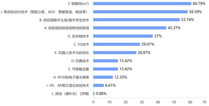 物联网、物流自动化技术、供应链数字主线/数字孪生技术、供应链控制塔或物流控制塔的应用都在40%~60%。见图15。