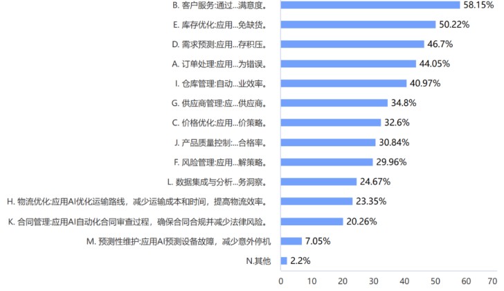 在“客户服务:通过聊天机器人和智能客服系统,AI可以提供7×24小时的客户支持,提高客户满意度”“库存优化:应用AI分析库存水平,自动调整补货策略,以最小化存储成本和避免缺货”“订单处理:应用AI自动化订单处理流程,从订单接收到发货的整个流程,减少人为错误”“需求预测:应用AI分析/利用历史数据和机器学习算法预测产品需求,提高库存管理和减少库存积压”这四个方面,是相对较多的企业开始应用AI技术的领域。