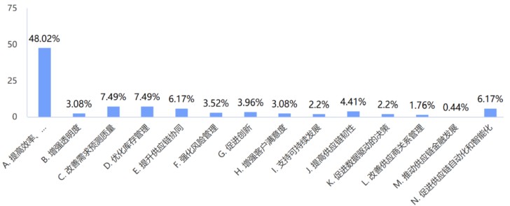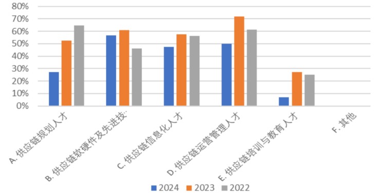 企业通常具备供应链日常运营方面的人才,但往往缺少综合型、创新型的供应链工程人才。该数据的变化反映了企业对此问题的认识加深,意识到专业人才在推动供应链数字化发展中的关键作用。