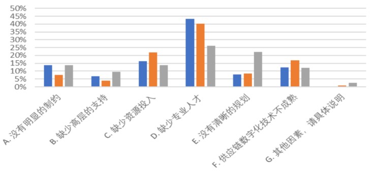 “缺少专业人才”连续3年成为制造企业供应链数字化发展的最大制约因素,而且占比从26%增加到43%。见图28、图29。