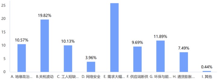 (2)“贸易保护主义和逆全球化”“能源短缺和价格上涨”“需求下降风险”,是制造企业未来供应链将面临的主要风险。