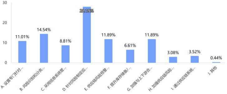 制造企业供应链风险管理措施较为分散,最多选项在“针对风险制定应急管理机制和流程/决策机制/应急处置机制”。见图32。