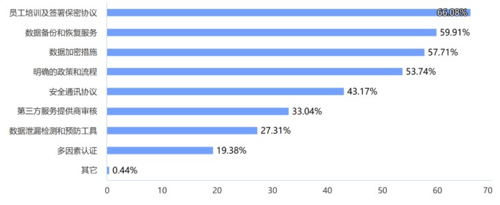(2)人员管理是关键环节,66%企业重视“员工培训”和“签署保密协议”,反映出企业意识到内部人员是数据安全链条中的重要一环,甚至是潜在风险点。通过培训提升安全意识、通过协议明确法律责任,是防范内部泄密的有效手段。