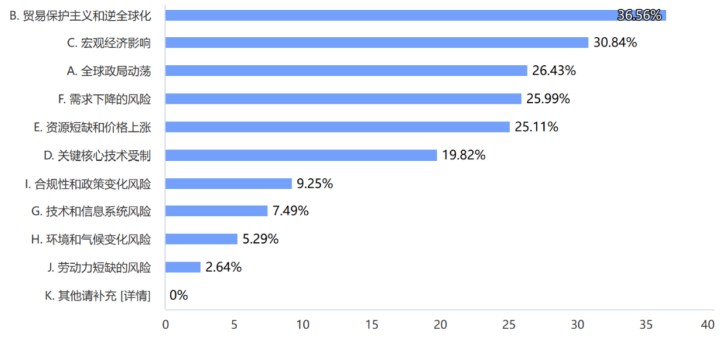 “贸易保护主义和逆全球化”“宏观经济影响”,是制造企业未来供应链将面临的主要风险。见图35。
