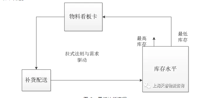 看板补货是一种拉式的物流模式,指在车间或装配线边设置物料存储区域,并对每种物料设置最高库存和最低库存,低于最低库存水平时看板拉动实现补货,如下图3所示。其分为单一看板和双看板,单一看板是指只有一个环节的看板补货即从供应商直接补货到车间,双看板是指从供应商到配送中心再到车间两个环节的补货。最高库存和最低库存水平则根据物料需求信息及相关分析来设定。