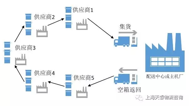 循环取货(milk run)通常由制造商或者第三方物流公司根据确定的取货路线、频次、时间窗到若干个供应商处依次取货,最后汇集并送到区域配送中心或者总装配企业车间,在此过程中还配合完成空容器的流转,即在上门取货前将空容器装车,到达供应商处先将对应空容器卸下再取货。如下图4所示。