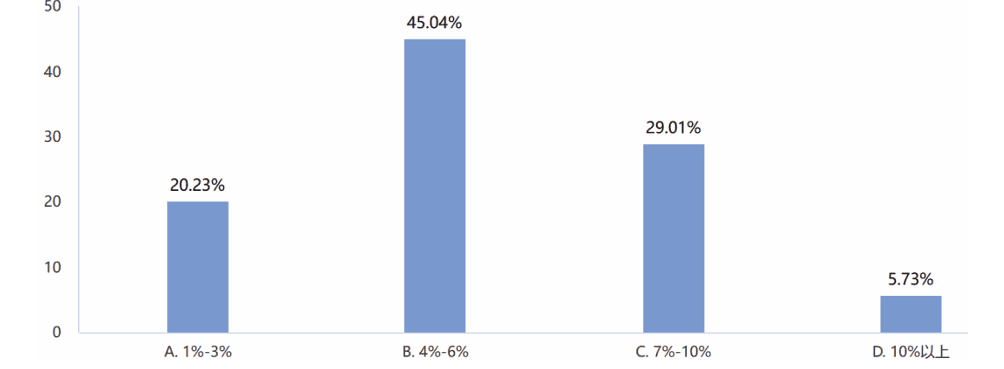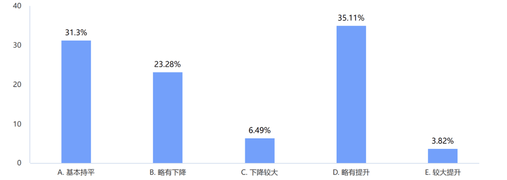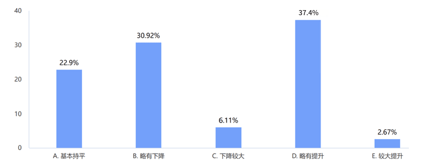 数据:被调查的企业中,“略有提升”的占比最高35%,其次是“略有下降”占比31%,加上“基本持平”的占比23%,总占比92%的企业营收整体上处于平稳状态。如图2所示。