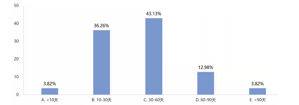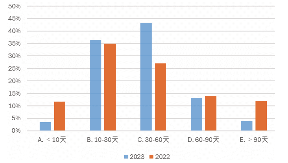 数据:2023年周转天数在30~60天的企业明显增多,占比43%,而加总超过30天的企业占比达到60%,2022年该数据为52%。如图8、图9。