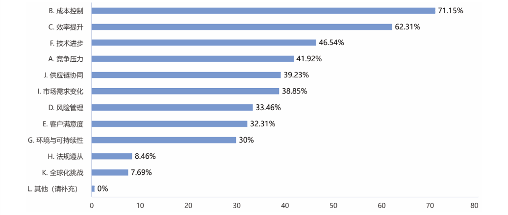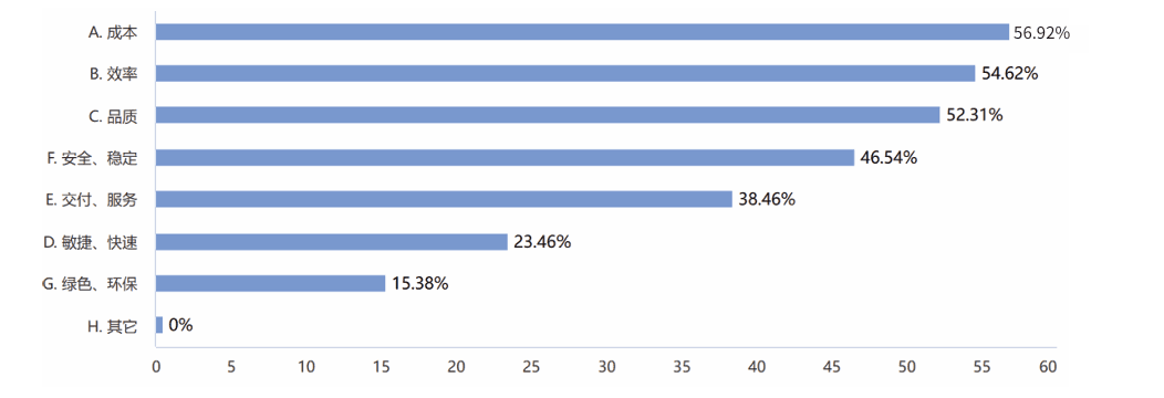 (2)在连续多年的调研数据中,绩效侧重点首选始终是“成本”指标。中国制造企业面临着国际市场的压力,更加需要通过不断寻求成本和效率的最佳平衡点,来维持在全球供应链中的地位。