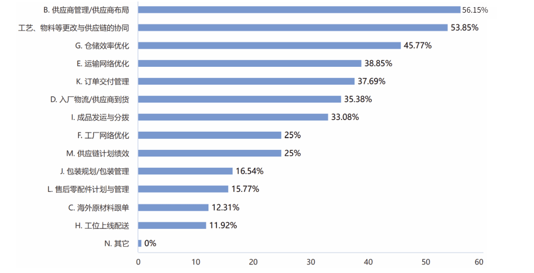 数据:该数据与往年的基本一致,供应商管理/供应商布局,占比56%;设计、工艺、物料等更改与供应链的协同,占比53.9%;仓储效率优化,占比45.7%。这三项是制造企业当前的供应链改善的重点环节。如图11。