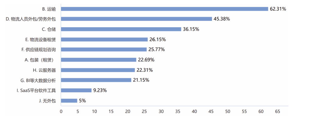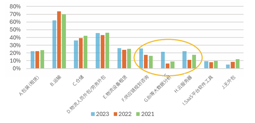 (2)对比过去两年,“供应链规划咨询”“BI等大数据分析”以及“云服务器”这三项外包服务的选择显著增加,这些服务的采纳有助于企业实现数字化转型。