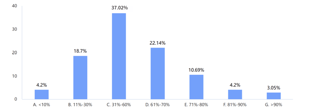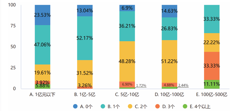 参与本次调研的企业主要分布于重工制造业(包括航天、机械机电、设备仪表、汽车等行业及相关零部件行业)27%,轻工制造业(包括家电、电子电工、医疗器械、鞋服、家居用品等行业及相关零部件行业)52%,石油化工、家化、医药等需GMP认证企业9%,零售流通及供应链服务行业12%。行业占比与其2023年营业收入规模范围分布如图1所示。