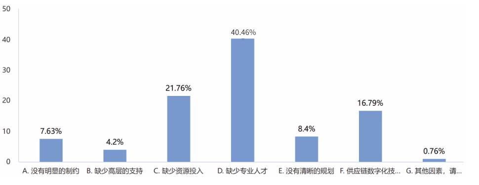 (3)供应链数字化发展的主要制约因素是缺少专业人才。国家层面已有针对性措施,企业需要多个方面入手,综合施策。