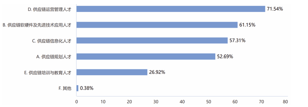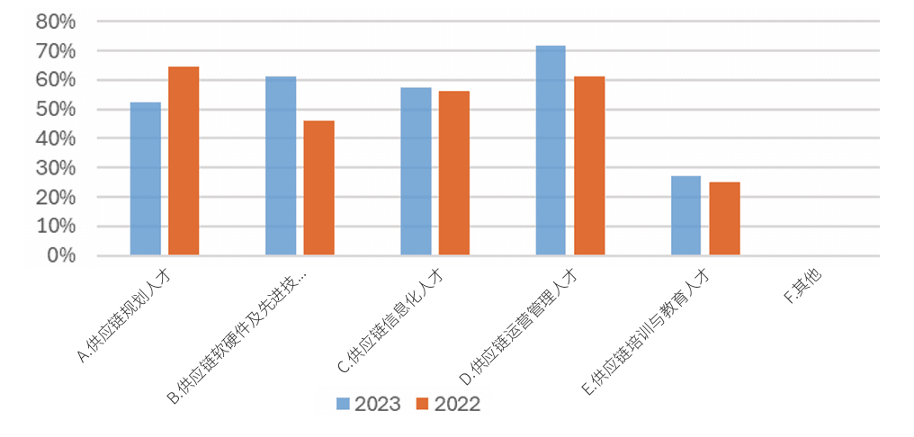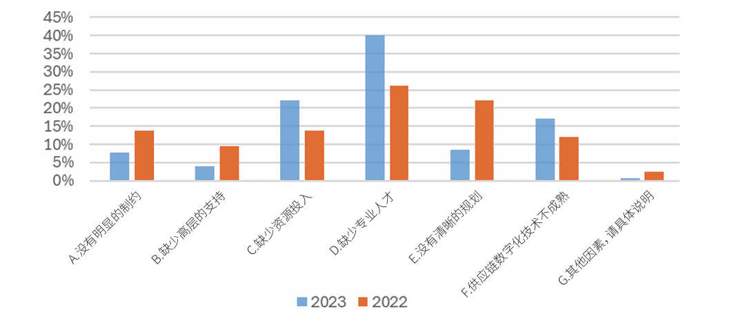企业通常具备供应链日常运营方面的人才基础,但是往往缺少综合型、创新型的供应链工程人才。该数据的变化反映了企业对此问题的认识加深,意识到专业人才在推动供应链数字化发展中的关键作用。