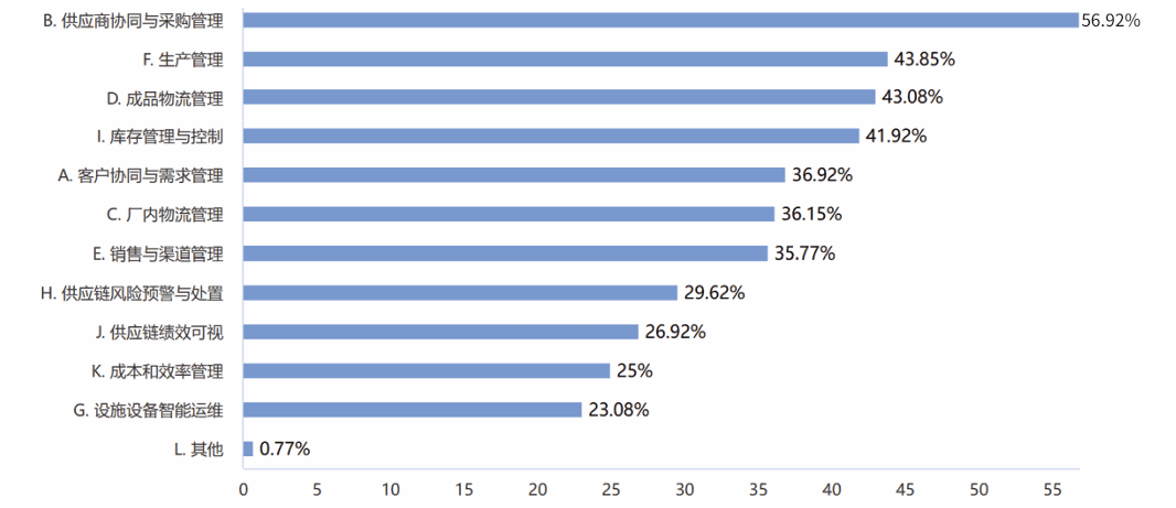 (3)设计、工艺、物料等更改与供应链的协同,供应商管理/供应商布局,以及仓储效率优化,这三项是制造企业当前关注的供应链改善重要关注点。