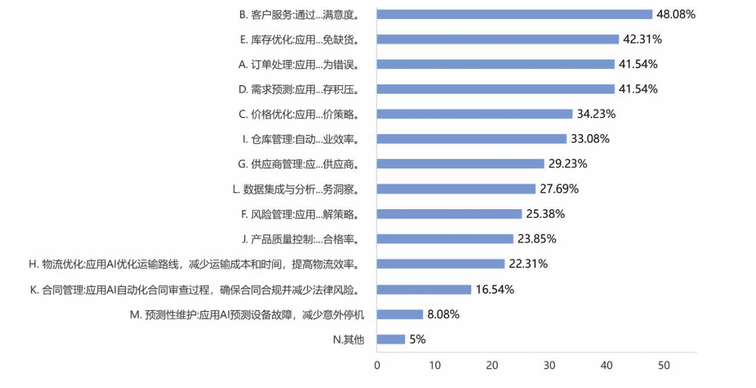 在“客户服务:通过聊天机器人和智能客服系统,AI可以提供24×7的客户支持,提高客户满意度”“库存优化:应用AI分析库存水平,自动调整补货策略,以最小化存储成本和避免缺货”“订单处理:应用AI自动化订单处理流程,从订单接收到发货的整个流程,减少人为错误”“需求预测:应用AI分析/利用历史数据和机器学习算法预测产品需求,提高库存管理和减少库存积压”这四个方面,都有超过40%的公司已有应用AI技术。