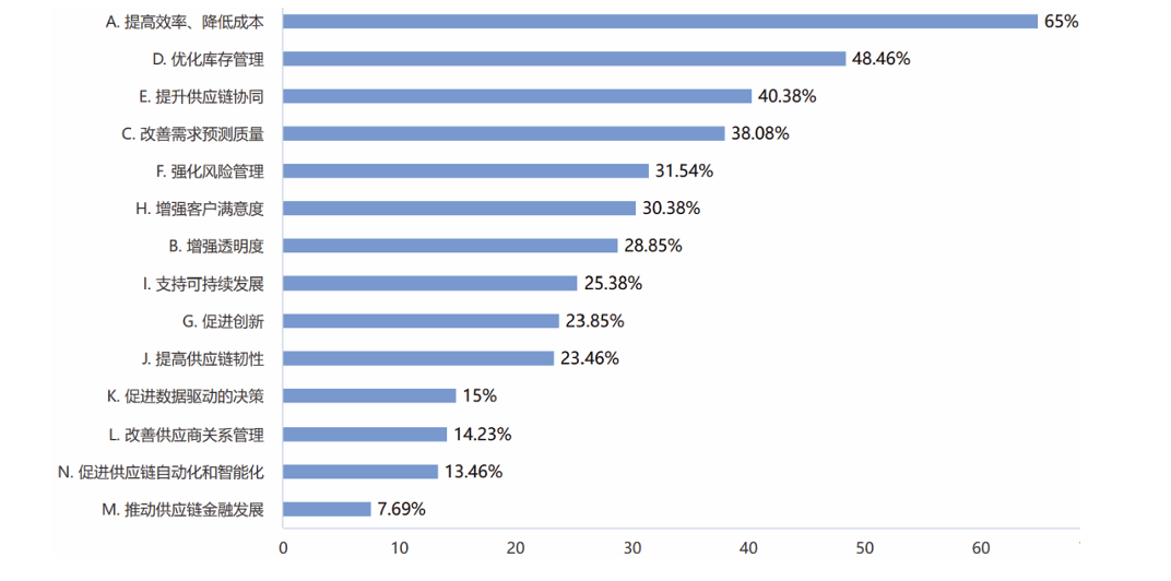 (6)65%的企业认为最大影响是“提高效率、降低成本”,数字化不仅关系企业自身效益,也影响着供应链网络上的相关合作方。合作方企业间需要协同,共同推动供应链的数字化转型。