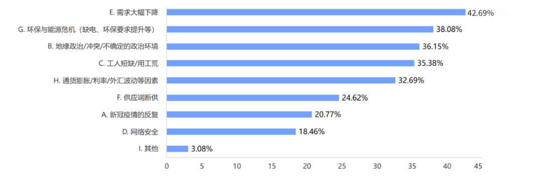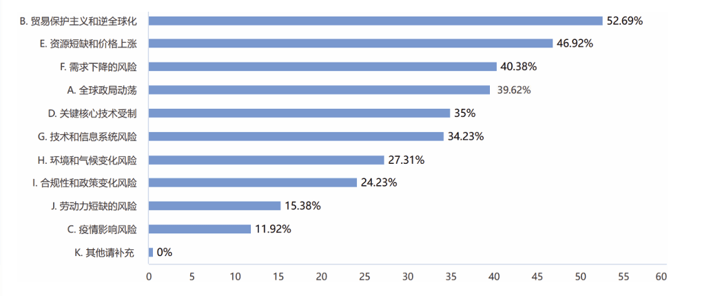 (2)“贸易保护主义和逆全球化”“能源短缺和价格上涨”以及“需求下降风险”,是制造企业未来供应链将面临的主要风险。