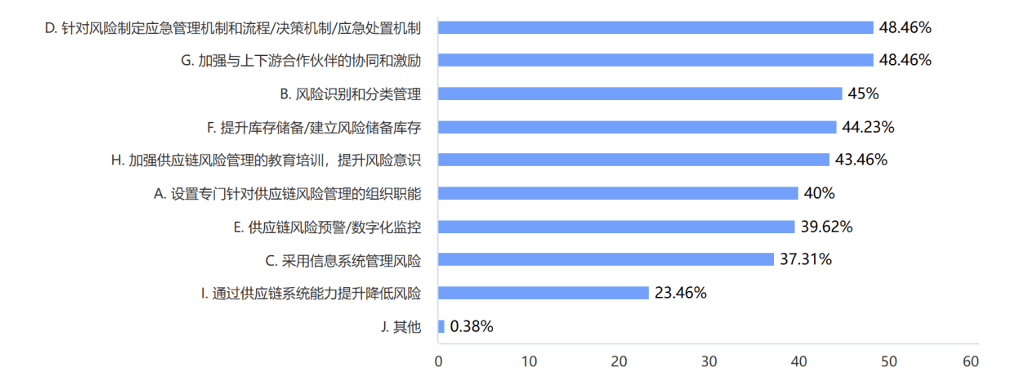数据:制造企业供应链风险管理措施较多集中在“针对风险制定应急管理机制和流程/决策机制/应急处置机制”和“加强与上下游合作伙伴的协同和激励”上。如图39。