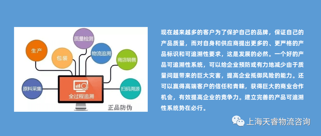 **现在越来越多的客户为了保护自己的品牌,保证自己的产品质量,而对自身和供应商提出更多的、更严格的产品标识和可追溯性要求,这是发展的必然。**一个好的产品可追溯性系统,可以给企业预防或有力地减少由于质量问题带来的巨大灾害,提高企业抵御风险的能力。还可以赢得高端客户的信任和青睐,获得巨大的商业合作机会,有效提高企业的竞争力。建立完善的产品可追溯性系统势在必行。