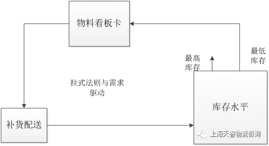 看板补货是一种拉式的物流模式,指在车间或装配线边设置物料存储区域,并对每种物料设置最高库存和最低库存,低于最低库存水平时看板拉动实现补货,如下图3所示。其分为单一看板和双看板,单一看板是指只有一个环节的看板补货即从供应商直接补货到车间,双看板是指从供应商到配送中心再到车间两个环节的补货。最高库存和最低库存水平则根据物料需求信息及相关分析来设定。