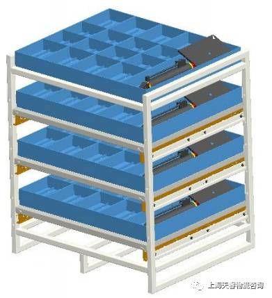 台套配送是在直送上线模式基础上进一步发展形成的一种物流模式,其主要思想是以工位为中心。台套配送分单工位多台套和多工位单台套,一个台套即一个工位几个节拍时间内装配所需的物料或者几个固定工位一个装配单位几个生产节拍所需的物料。台套配送体现在拣货、配送的容器上,对于某些工位需要的零部件设计专门的容器,如下图5所示,这是对某工程机械产品装配线的某工位设计的专用容器。如果是几个工位乃至一条线所有零部件物料都存放在一个容器里,该容器会随着装配线工位的移动而移动,即在第一个工位装配完毕后,容器随产品一起流到第二个工位,依次移动直到完成装配。