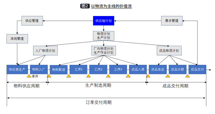 物流规划的重点在于创建连续流,创造快速流动的基础条件。如图2所示,以物流为主线,从端到端的角度看待价值流,其本质是用合理的、较低的成本提供较高的交付服务水平,在这样一个复杂系统中,整体均衡比局部高效更重要,全局协同比节点执行更重要。以物流为主线的价值流优化,应以计划协同为驱动,实现时间和库存的合理规划,其目的在于准确地响应需求、缩短交付时间和降低库存。因此,需要对物流过程进行整体的规划,以实现端到端“事实上的平衡”。