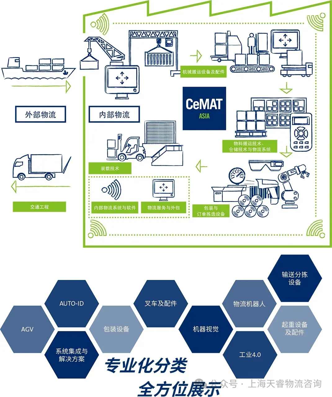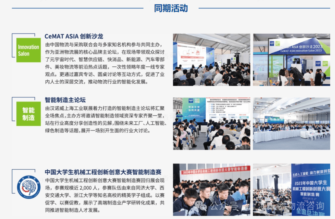 11月5日下午场,”新型供应链,促进新质生产力”研讨会专场,将由行业顶级专家与新型供应链企业供应链管理者共同探讨以下热门话题:新型供应链,促进新质生产力、制造业全程供应链运营重板-供应链韧性、智能供应链-AI驱动的创新与优化、ESG在制造企业供应链管理中的应用等,同期将举办CeMAT ASIA 2024 亚洲国际物流技术与运输系统展览会。