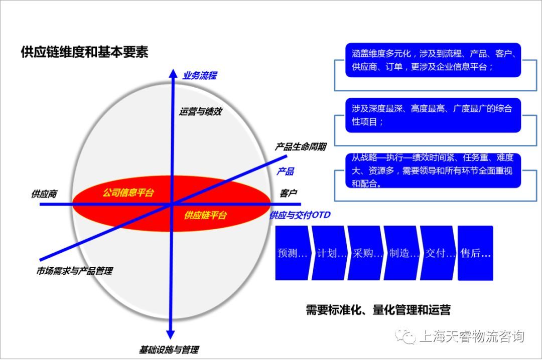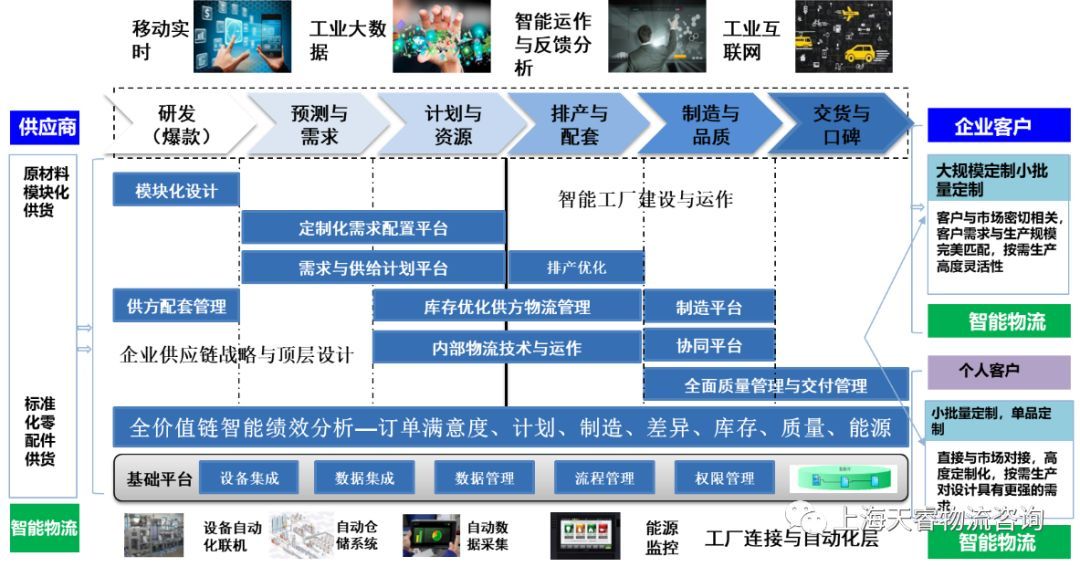 对于智能制造而言,制造企业的供应链管理与分销企业、第三方物流企业具有完全不一样的逻辑,前者具有明确的市场定位、产品研发、预测、生产计划、物流计划、采购计划、成品发运计划、客户订单管理、库存与物流信息控制等功能环节,如果可以的话,我们可以通俗地称之为“全供应链”;而后者更多的是其中的某一个环节或功能。