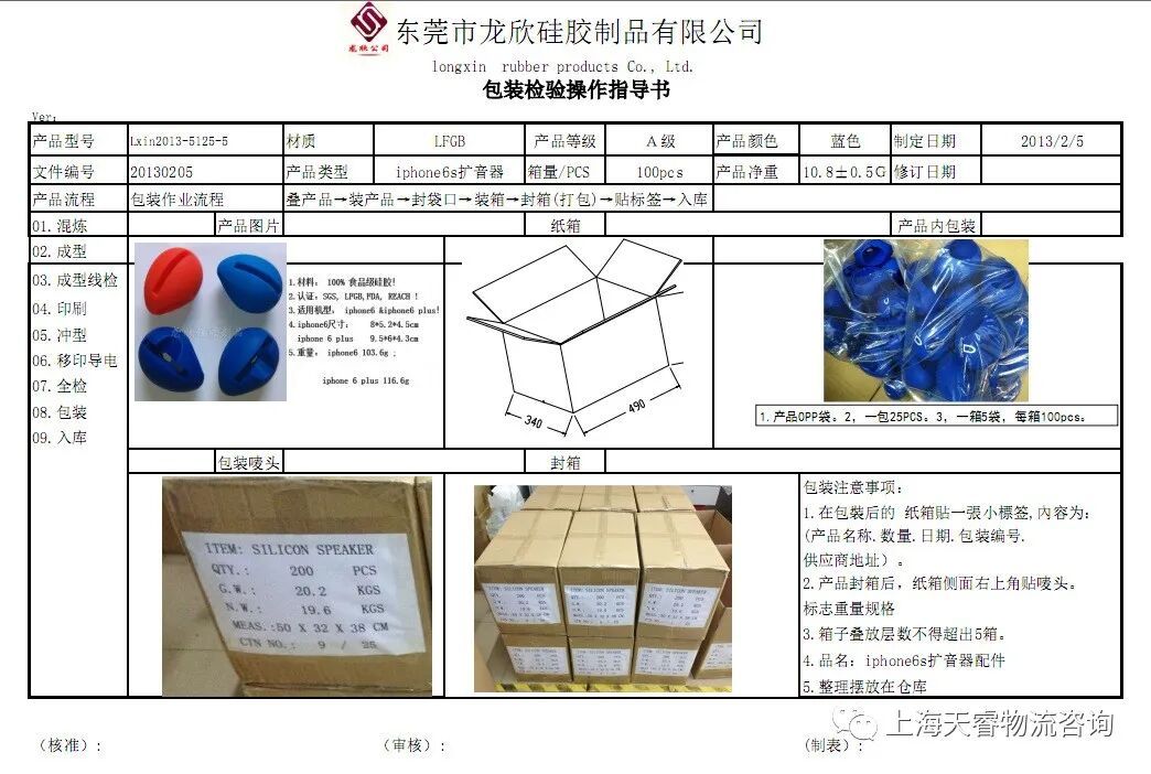 **定期对发货作业进行审查,以确保包装符合规定。**首先要把产品包装的要求和作业方法传达到发货作业区的每一位员工。**供应链部门可以采用产品包装明细表来说明每一个产品的标准包装,包括包装的外形、材料、内格栅和包装数量,**可以采用《包装作业指导书》来指导工人如何进行包装。其次是进行培训,搞通书面文件的要点是应知,学会怎样包装是应会,员工们应知应会都通过考核和技能测试了,就可以上岗负责评审发出产品包装的审核了。