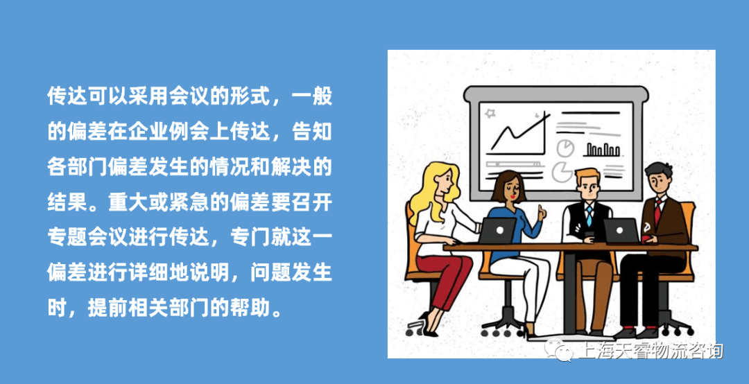 传达可以采用会议的形式,一般的偏差在企业例会上传达,告知各部门偏差发生的情况和解决的结果。重大或紧急的偏差要召开专题会议进行传达,专门就这一偏差进行详细地说明,问题发生时,提前相关部门的帮助。问题发生中,告知解决的过程和情况,预期的结果等。问题发生后,展示佐证资料,告知问题解决的结果。请相关部门进行评审。