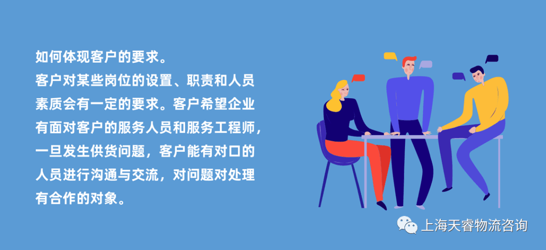 **四、如何体现客户的要求。****客户对某些岗位的设置、职责和人员素质会有一定的要求。**客户希望企业有面对客户的服务人员和服务工程师,一旦发生供货问题,客户能有对口的人员进行沟通与交流,对问题对处理有合作的对象。客户希望在某些人员职责中体现他们的要求,如写清接收订单的职责,有受理客户投诉的职责等。客户还对人员的能力和素质有一定的要求,如大多数客户要求有关人员能够熟练操作计算机软件,通过与客户连接的软件系统进行信息交互。国外的客户会要求该岗位的人员有语言和文字沟通能力。