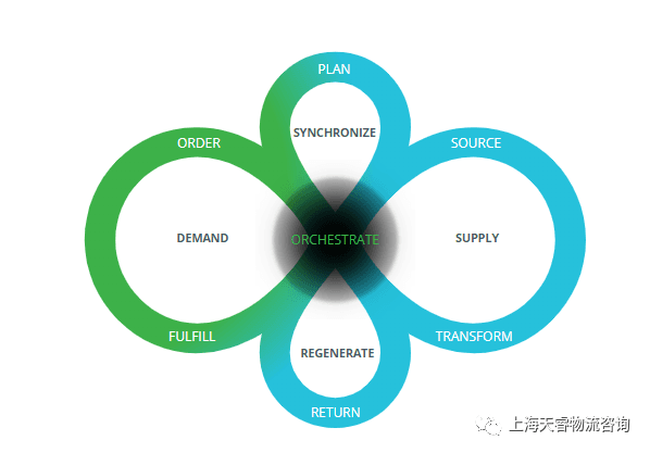 但**模型的图形构架了围绕Orchestrate的双无限循环,打破了传统供应链的直线型“链Chain”,明确了网络化的内涵。**同时表示当前供应链的“循环looped、连续continuous、连接connected”性质。