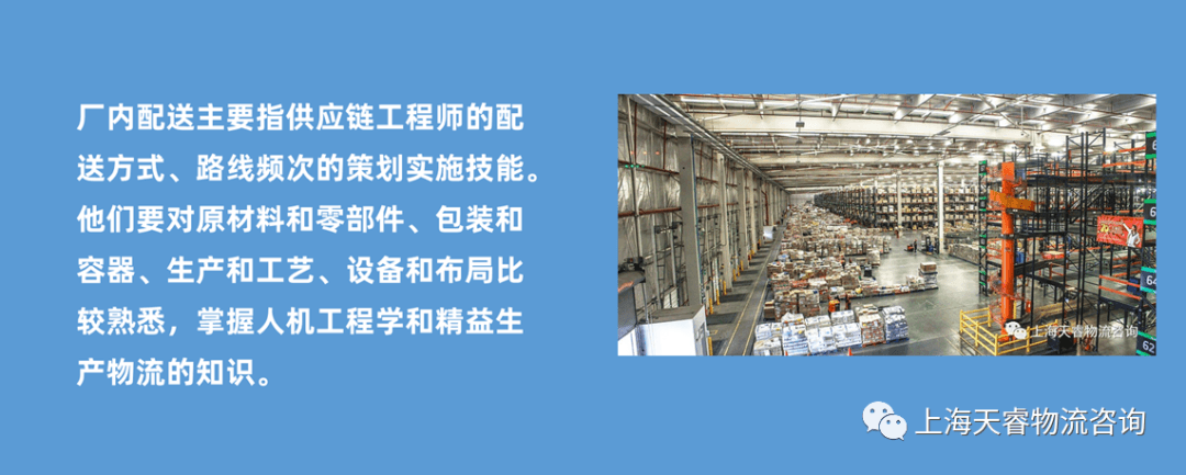 **3、厂内配送主要指供应链工程师的配送方式、路线频次的策划实施技能。**他们要对原材料和零部件、包装和容器、生产和工艺、设备和布局比较熟悉,掌握人机工程学和精益生产物流的知识。