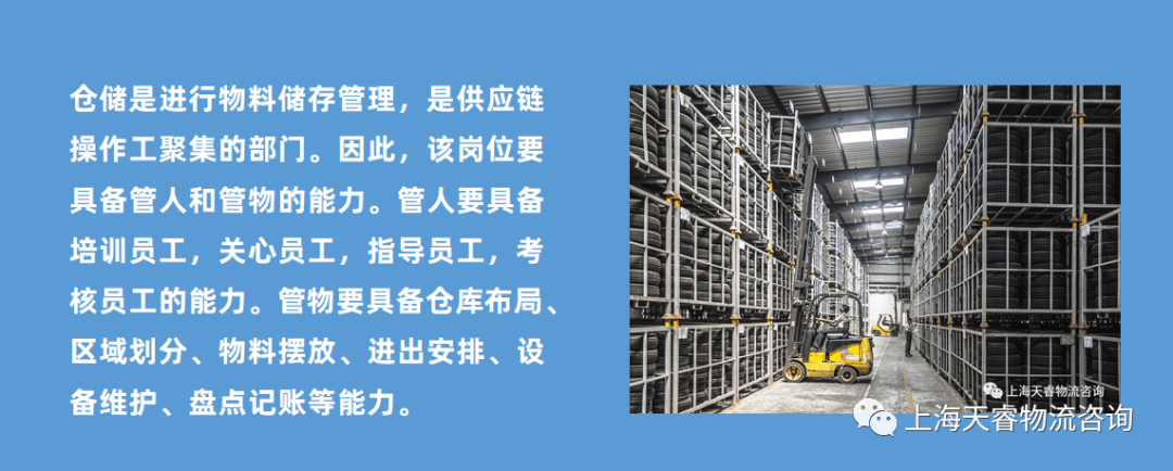 **5、仓储是进行物料储存管理,是供应链操作工聚集的部门。**因此,该岗位要具备管人和管物的能力。管人要具备培训员工,关心员工,指导员工,考核员工的能力。管物要具备仓库布局、区域划分、物料摆放、进出安排、设备维护、盘点记账等能力。