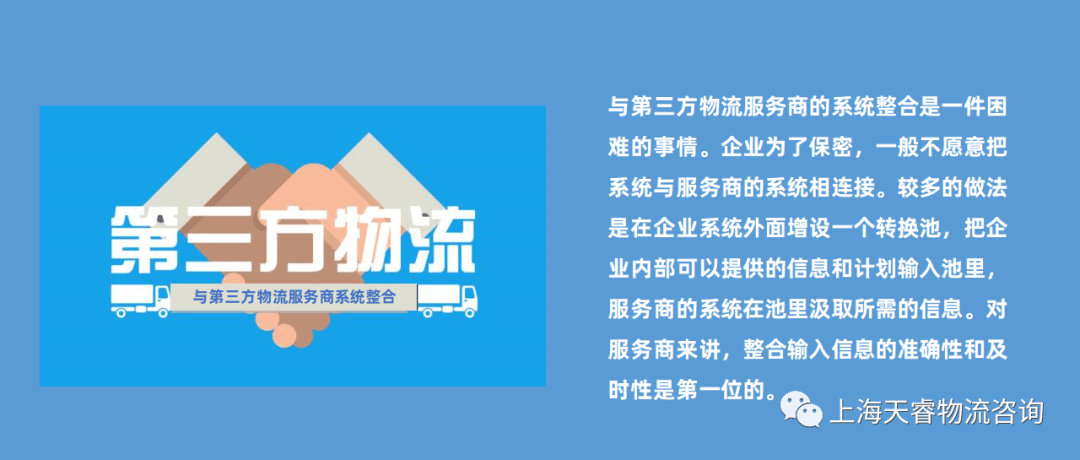 **与第三方物流服务商的系统整合是一件困难的事情。**企业为了保密,一般不愿意把系统与服务商的系统相连接。**较多的做法是在企业系统外面增设一个转换池,把企业内部可以提供的信息和计划输入池里,服务商的系统在池里汲取所需的信息。对服务商来讲,整合输入信息的准确性和及时性是第一位的。**他们面对的客户众多,需要制定合理的排程计划,通过计划执行来满足两边客户的需求,同时让资源得到充分的利用。他们对信息的偏差十分敏感,往往一发现,立刻会主动询问,确认信息的真实性,以便做出恰当的反应。