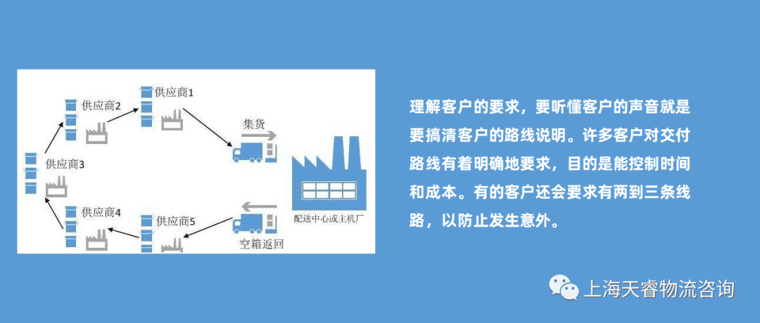 **理解客户的要求,要听懂客户的声音就是要搞清客户的路线说明。**许多客户对交付路线有着明确的要求,目的是能控制时间和成本。有的客户还会要求有两到三条线路,以防止发生意外。**对采用循环取货(MILKRUN)企业,理解客户的路线说明就知道卡车何时会来取货,对物流时间的控制,物流效率的提高和物流成本的降低有着重要的影响。**因此,不能掉以轻心。