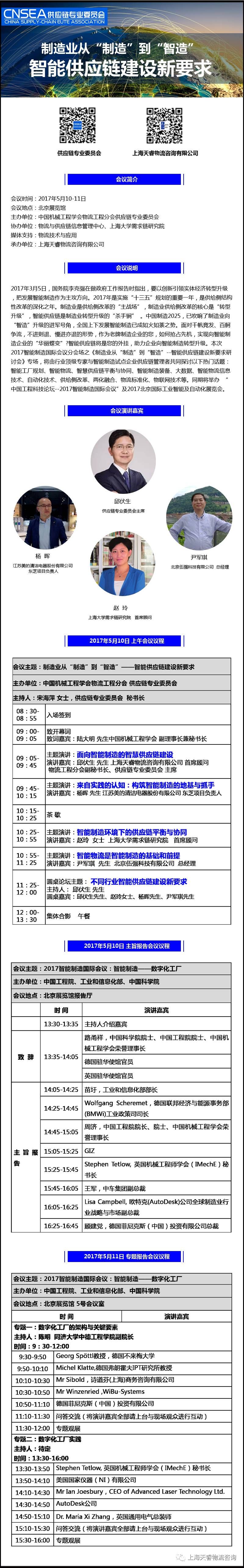 中国机械工程学会物流工程分会,供应链专业委员会主办、上海天睿物流咨询有限公司承办的“第六届物流装备绿色与智能技术发展研讨会(供应链专业委员会第二十九次会议)——制造业从“制造”到“智造”--智能供应链建设新要求研讨会”将于2017年5月10-11 日在北京召开,诚邀您的参与。同期举办:中国工程科技论坛——2017智能制造国际会议、2017北京国际工业智能及自动化展览会。