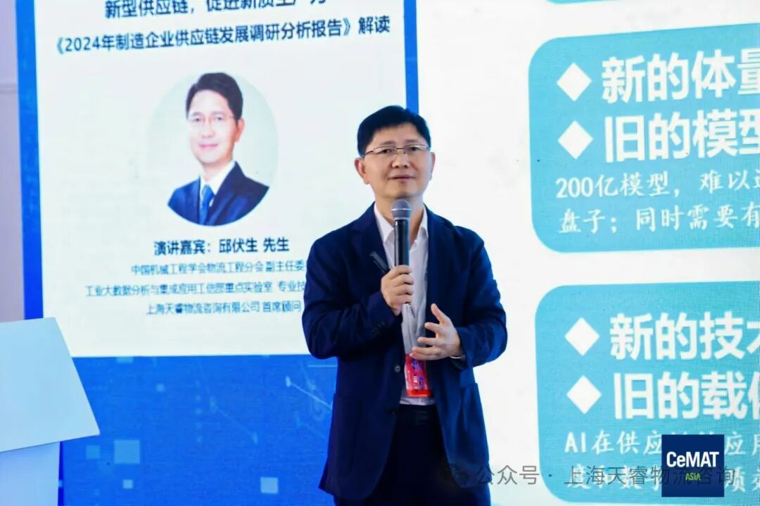上海天睿物流咨询有限公司首席顾问、中国机械工程学会物流工程分会副主任委员邱伏生先生,分享两个主题,分别是“新型供应链 促进新质生产力”与“《2024年制造企业供应链发展调研分析报告》解读”。