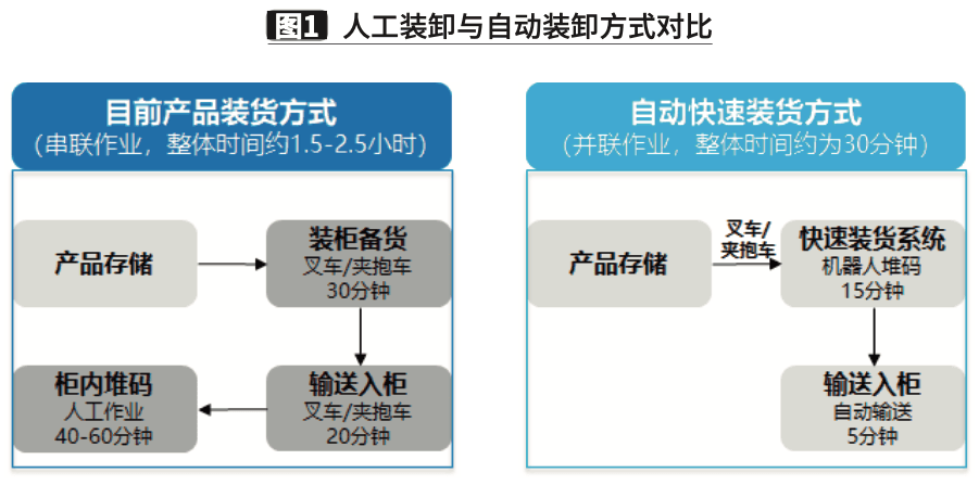一是装货效率提升,减少人工作业,降低作业强度:通过运用自动搬运、自动输送等技术设备,实现产品从存储区到备货区,从备货区到柜内堆码的全流程自动化作业。通过以上措施和方法,将目前1.5~2.5小时的装柜作业时间压缩至30分钟以内,减少货柜和月台的长时间占用,以最大程度实现集装箱柜的即停即走,提升整体装货效率,同时提高月台的有效利用率。