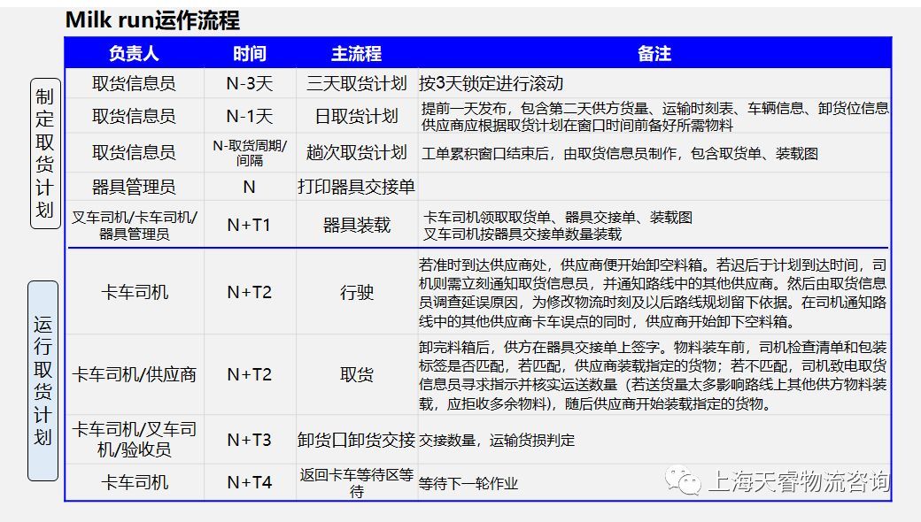 在取货计划之前,采购部门根据计划部门的预测计划和月度计划制作采购计划,并共享给供应商以方便供应商的采购备料生产(尤其供方所需物料为长周期的)。对于本地Milk-run,根据3天刚性计划制作取货计划,除此之外还要根据实时生产进度不断微调取货计划,按照设定的提前期,打印取货单和器具交接单。