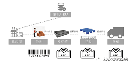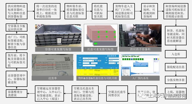 第十六步:供应商从容器中心提取自家容器、托盘,经过主机厂门口时标签再次被读取,这些被读取的信息与司机标签绑定(主要是有些货车周围是封闭的,装在里面的容器标签被屏蔽,需要读取司机标签来解套);