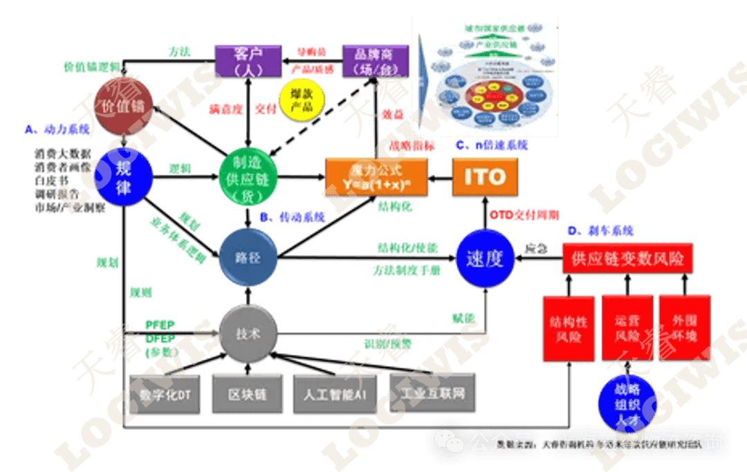 **(1) 动力系统:**这部分是供应链的驱动力,通过供应链的数字化智能化解决消费者的个性化需求,并通过分析从订单到交付服务(OTD)的价值锚逻辑,发现供应链服务的内在规律,从而通过技术系统来驱动整个供应链的全过程营运,解决的是方向性的问题。