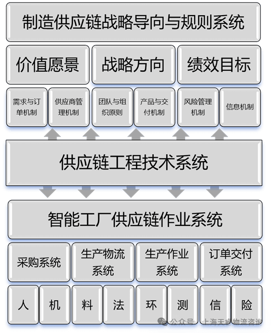 作为一项系统工程,SMSC的构建通常包括以下三个子系统:智能制造供应链战略与规则系统、供应链工程技术系统和智能工厂供应链作业系统。如图1所示。