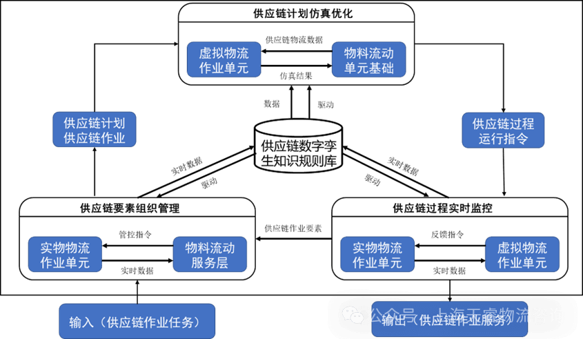 在此过程中,需要通过供应链数字孪生模型对整个供应链过程进行实时监控,以保证实物物流作业单元和虚拟物流的作业单元,实时响应并高度一致。所有这些运营规则都需要通过智能制造上位主机系统给出的作业指令,通过供应链虚拟平台,通过MBSE模型中“总-分-总”的模式,实现参数分解和数据集成,之后通过仿真确认其合理性、有效性;另一方面,上述过程都是通过供应链数字孪生知识规则库来提供底层逻辑支撑,从而实现供应链数据与生产数据实时化、一体化、以保证智能制造系统功能逻辑的完整性和准确性。