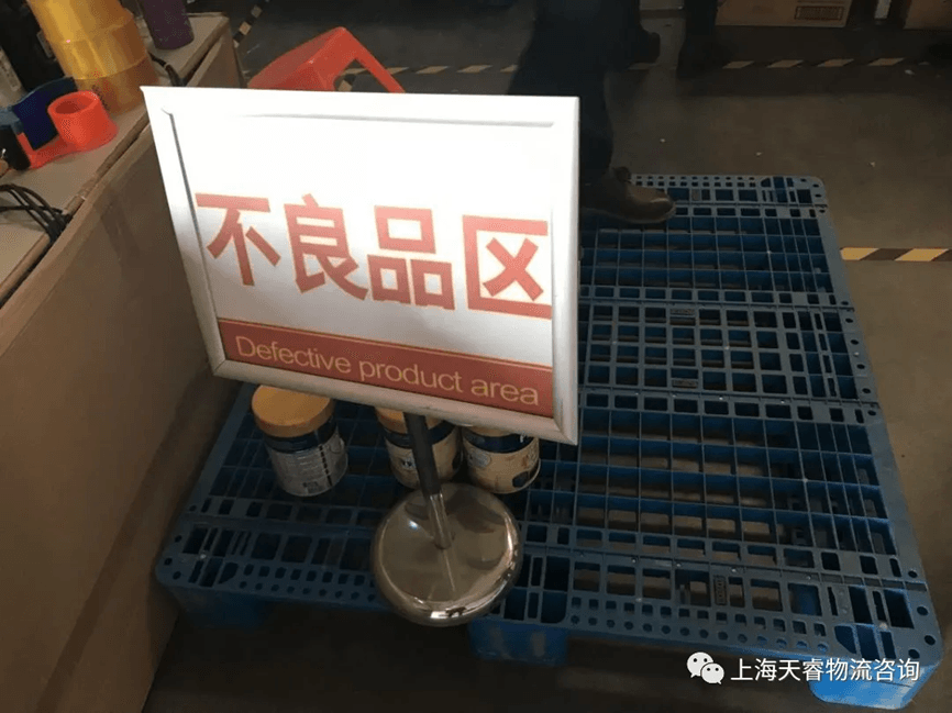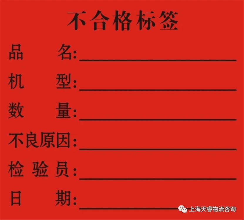 在企业里,一般采用“绿色”作为合格的标志,“红色”作为不合格标志,“黄色”作为待检或可疑标志。不合格的物料用红色标签张贴在外包装上,一般使用在物料入厂检验和产品发运阶段,生产阶段一般使用红色容器放置不合格零件或产品。如果发生批量的不合格品,企业会使用红色绳带进行围挡。有的企业物件比较大,就在地面上划出一块红色区域,专供摆放不合格品。企业的物流区域对不合格品的标识规定与生产区域大致相同。